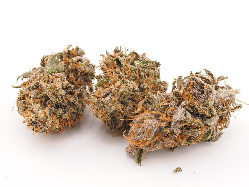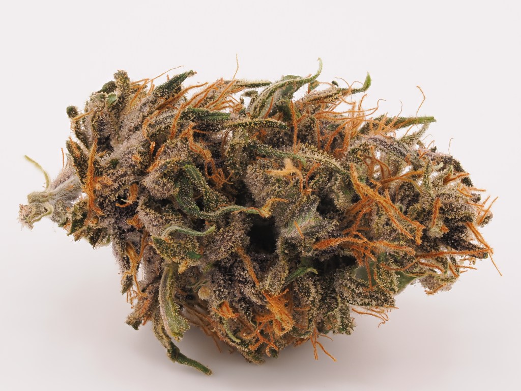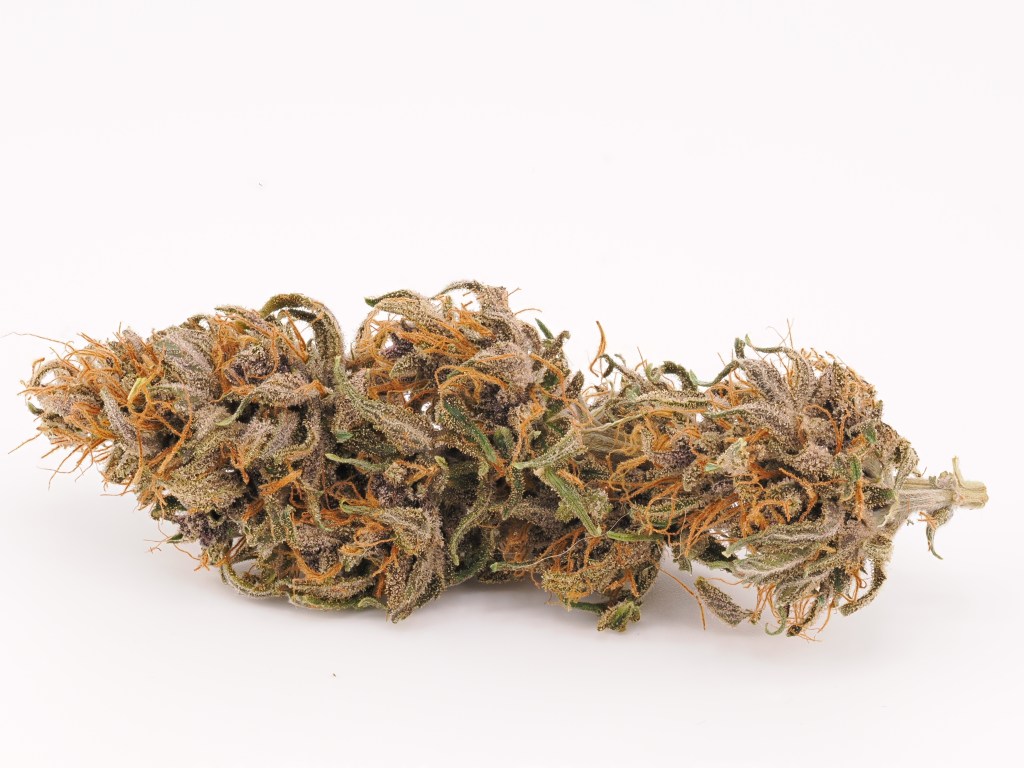 Appearance: B- (Loose, spear structure. Dark purple with heavy trichomes and orange pistils)