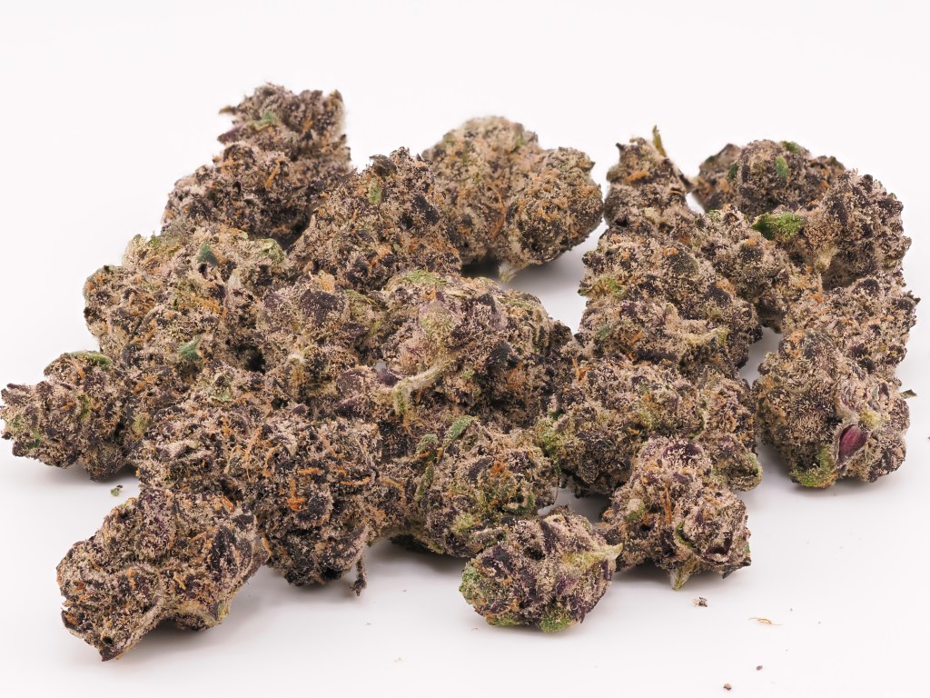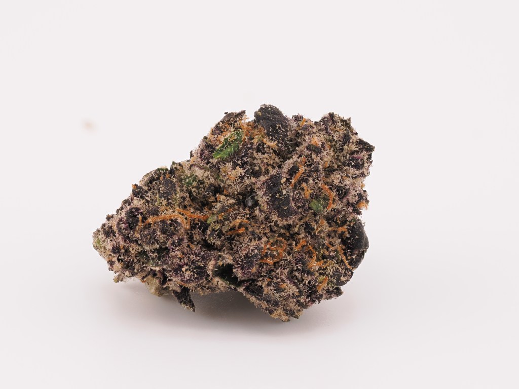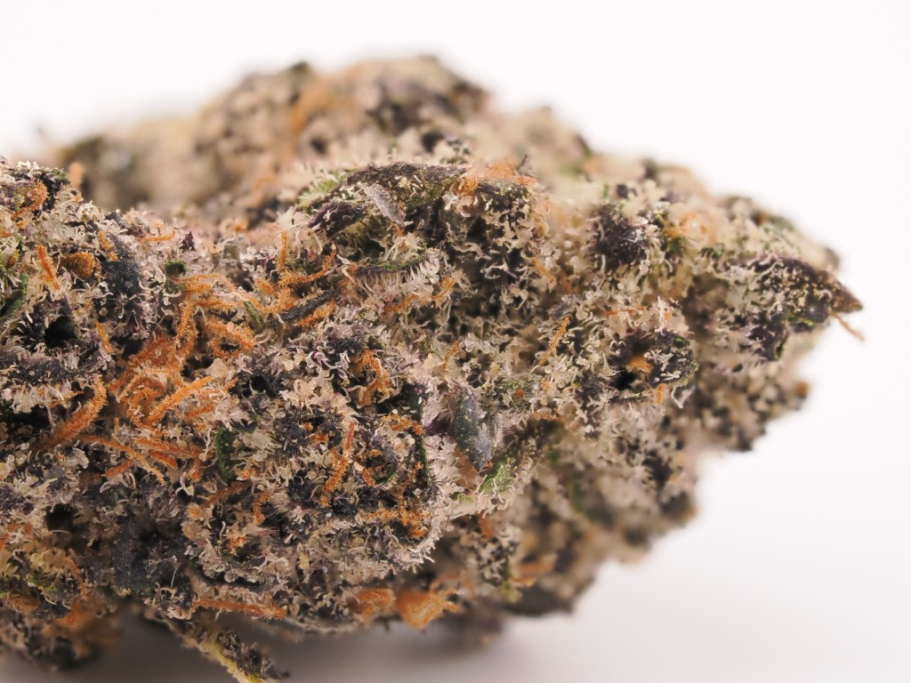 I received a 1/4 of small flower. Upon opening up the pack, the first thing that I noticed was how purple the flower is. It’s such a deep purple that it’s reminiscent of a bruise. The dark purple flower is contrasted by brighter orange hairs and frosty trichomes. Some of the buds have beautiful trichome clusters and really standout once you observe them closely. There’s very little I think would improve the quality on this and it does have me excited to see what those top colas looked like. The cure is excellent. Buds give a nice loud snap and the stickiness is all the way there.
